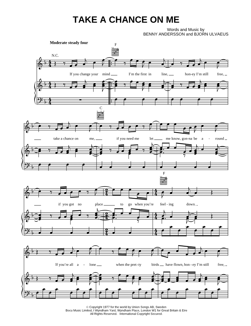 If you change your mind I'm the first in line, honey I'm still free, take a chance on me, if you need me let me know, gonbe around if you got no place to go when you're feeling down. |