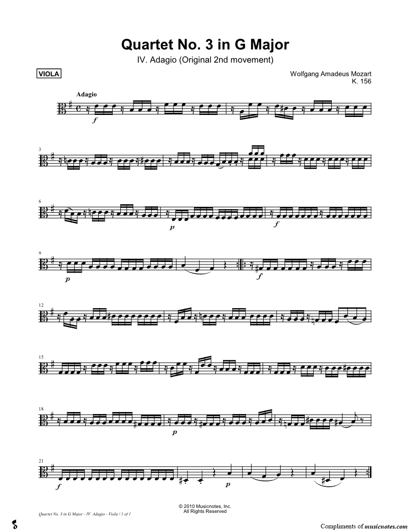 Quartet No. 3 In G Major, K. 156: IV. Adagio - Viola Part |