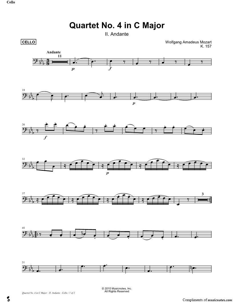 Quartet No. 4 In C Major, K 157: II. Andante - Cello Part |