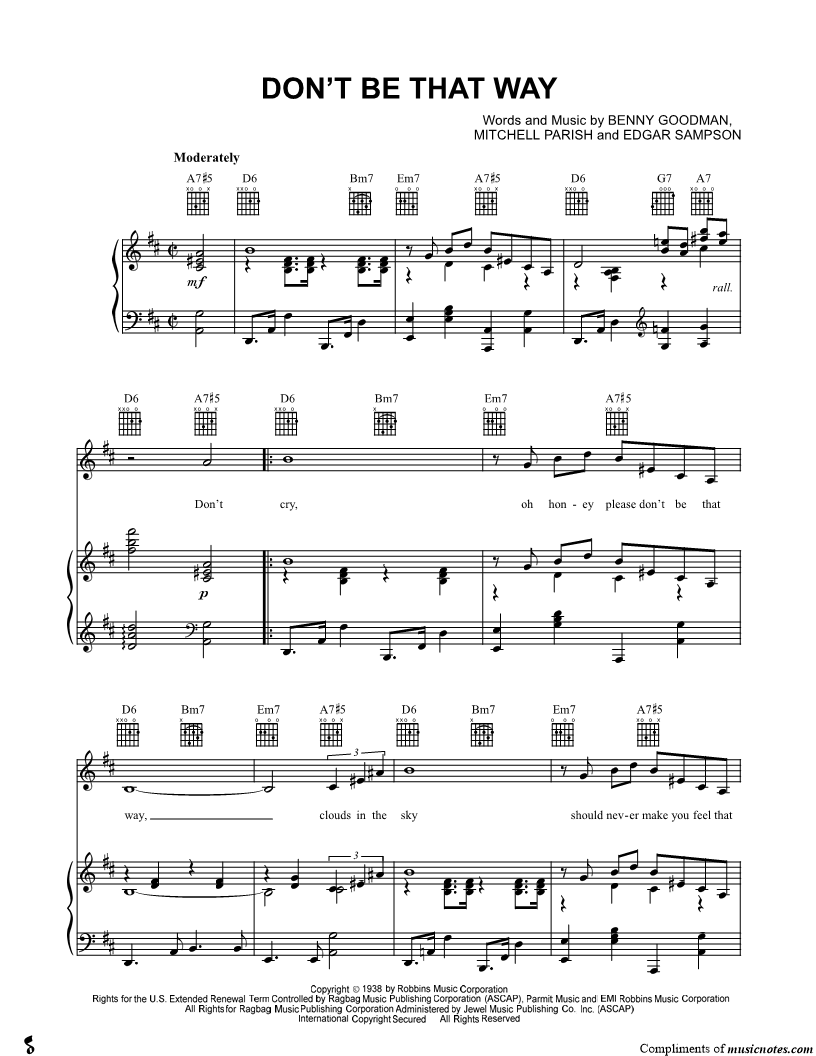 Don't cry, oh honey please don't be that way, clouds in the sky should never make you feel that way, the rain will bring the violets of May, tears are in vain, so honey, please don't be that way, as long as we see it t |