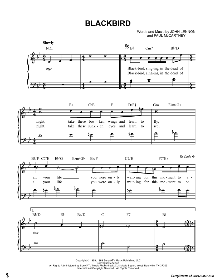 Blackbird, singing in the dead of night, take these broken wings and learn to fly; all your life you were only waiting for this moment to arise. |