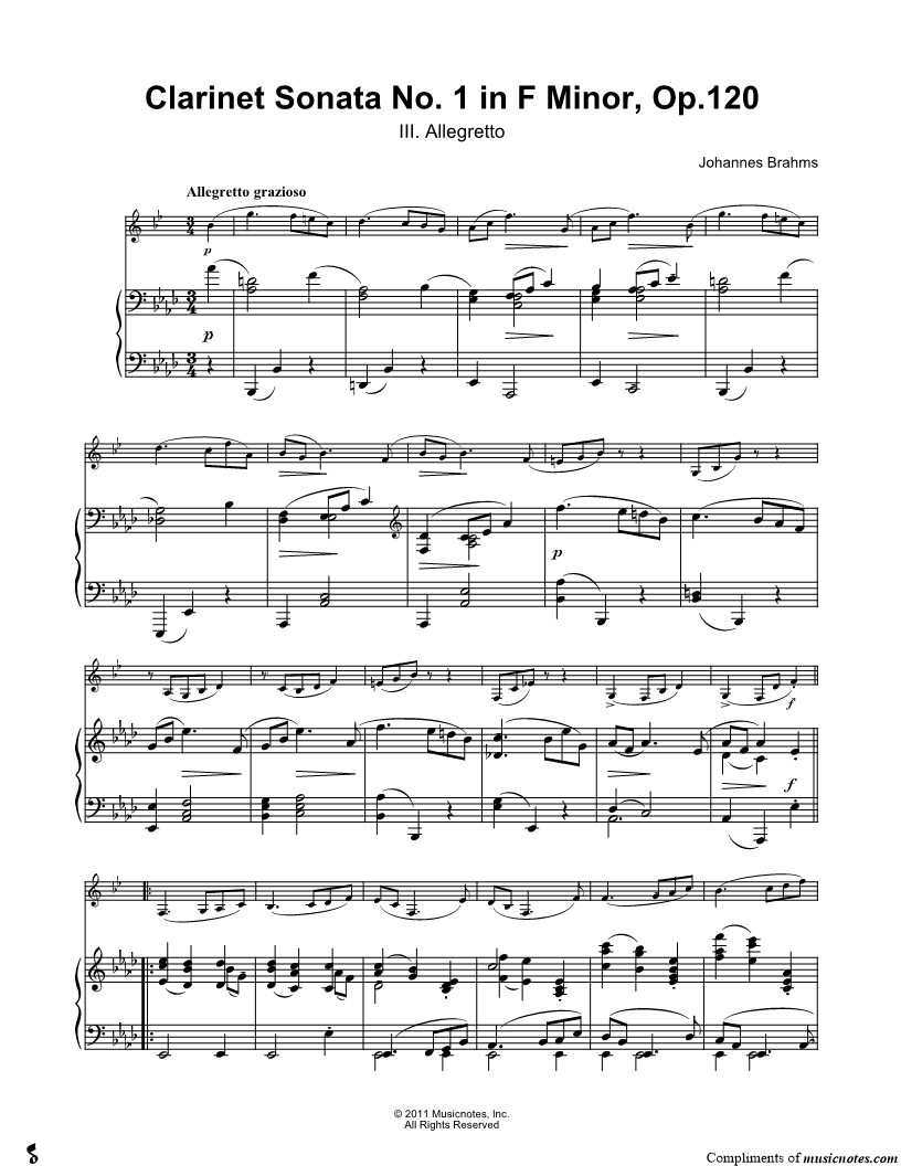 Clarinet Sonata No. 1 In F Minor, Op. 120: III. Allegretto - Piano Accompaniment |