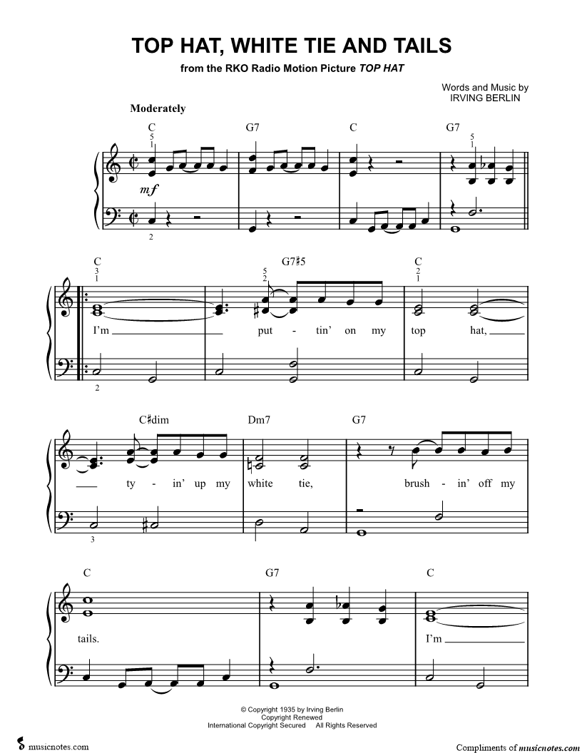 I'm puttin' on my top hat, tyin' up my white tie, brushin' off my tails. |