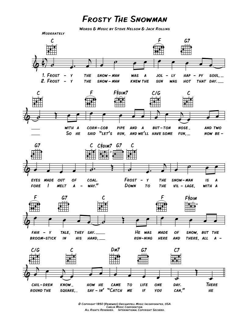 Frosty the snowman was a jolly happy soul, with a corncob pipe and a button nose and two eyes made out of coal. |