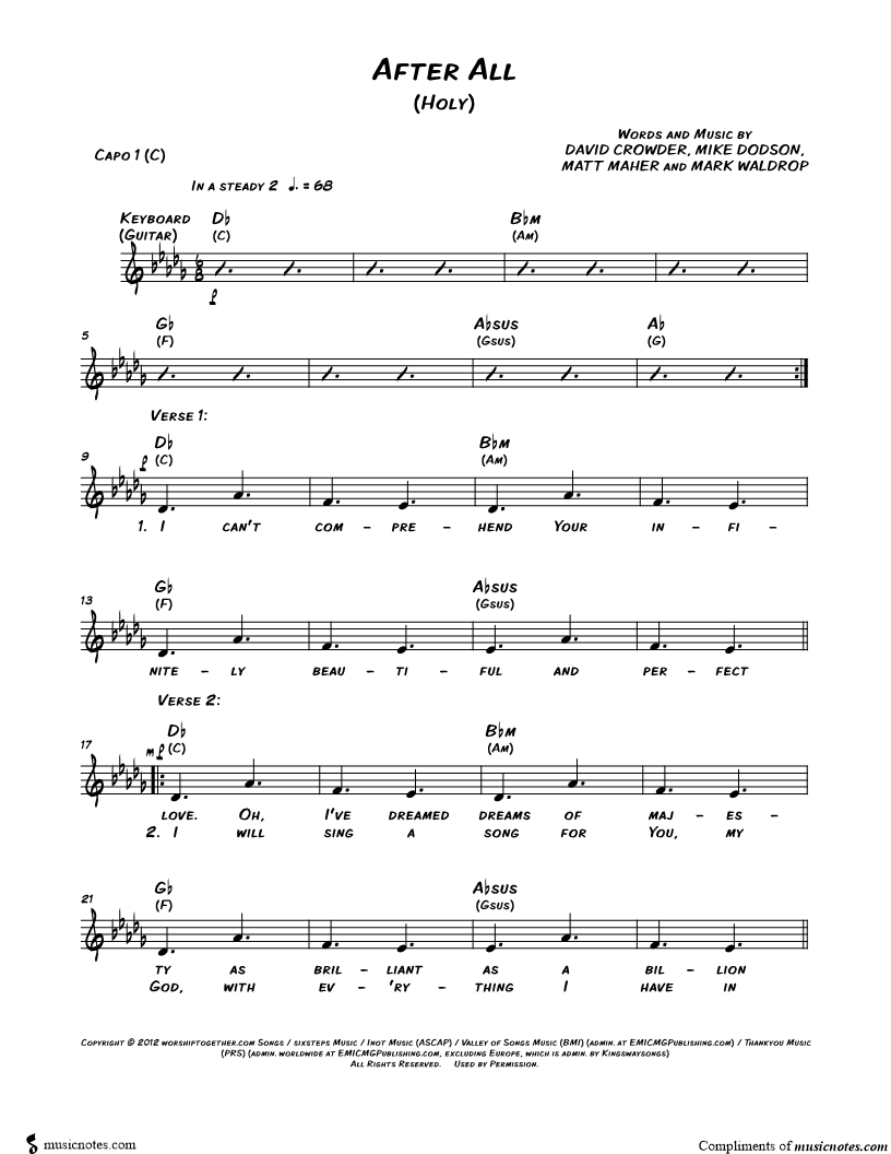 Many of the arrangements on Musicnotes have transpositions available, typically in C Major, as well as 3 sharps and 3 flats. If you do not see your desired key, you can request a transposition by reaching out to Customer Support.