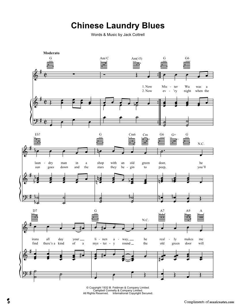 Now Mister Wu was a laundry man in a shop with an old green door, he irons all day your linen away, he really makes me sore; he's lost his heart to a Chinese girl, and his laundry's all gone wrong. |