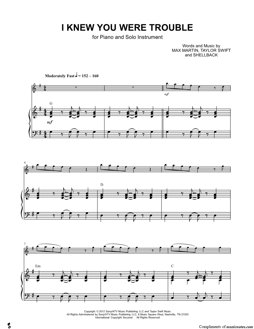 Collection: I Knew You Were Trouble - C Instrument & Piano