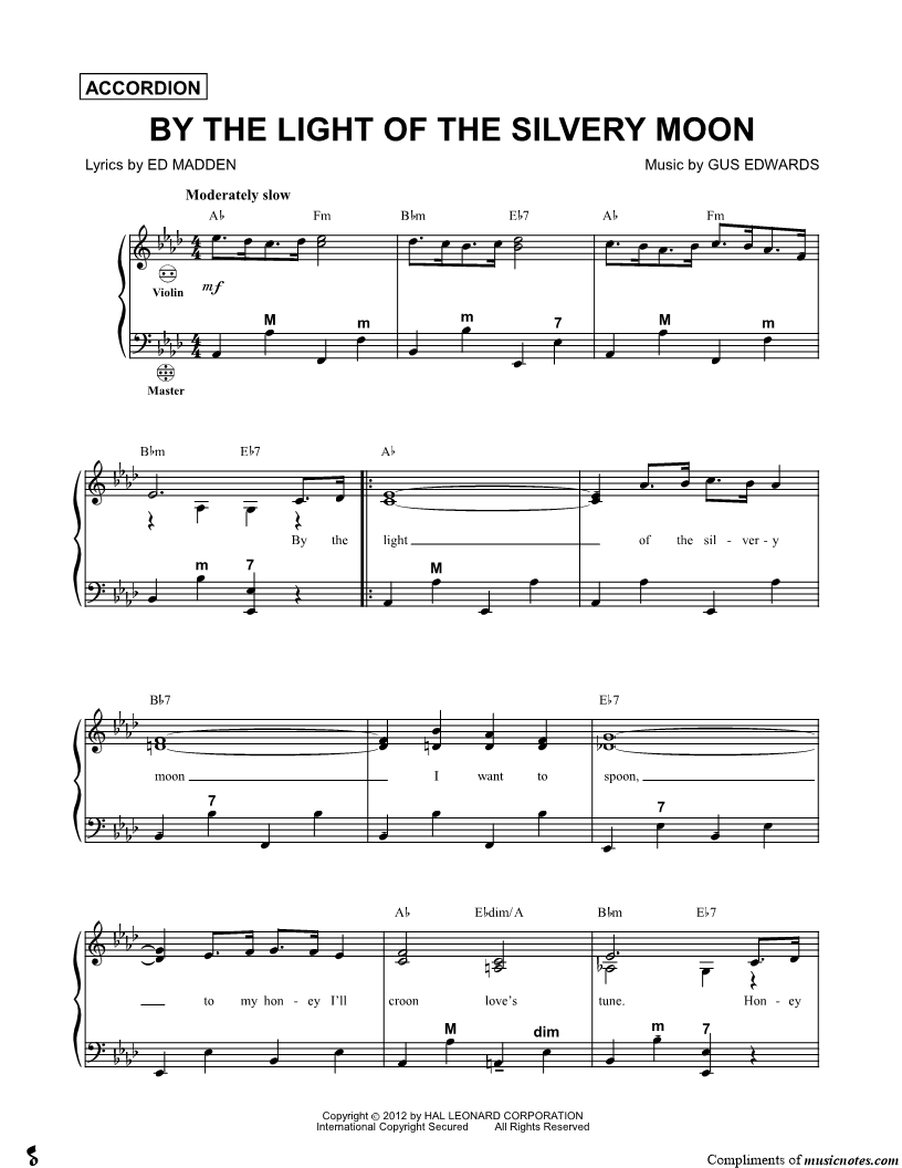 By the light of the silvery moon I want to spoon, to my honey I'll croon love's tune. |
