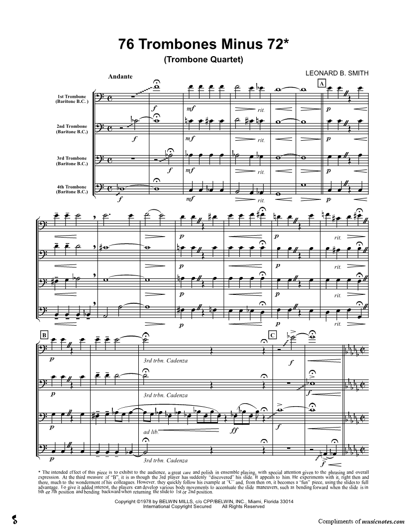 Trombone 1, range: F3-F#4 Trombone 2, range: Eb3-Eb4 Trombone 3, range: Db3-D4 Trombone 4, range: Gb2-D4 | |