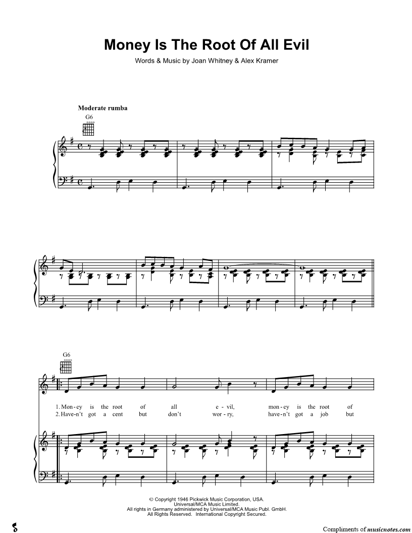 Money is the root of all evil, money is the root of all evil, won't contaminate myself with it, take it away, take it away, take it away, if a woman call a man honey, and it's on account of his money, honey and money will soon be gone, take it away, take it away, take it away. |
