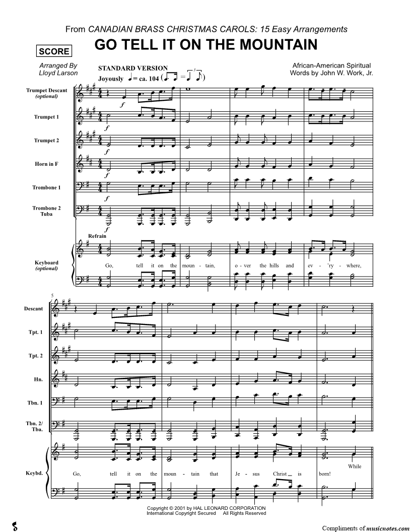 Trumpet 1, range: E4-F#5 Trumpet 2, range: C#4-D5 French Horn, range: A3-B4 Trombone 1, range: D3-E4 Trombone 2, range: G1-C4 Tuba, range: G1-C4 Trumpet, range: E4-G#5 or Descant Keyboard or 4-Part Choir | |