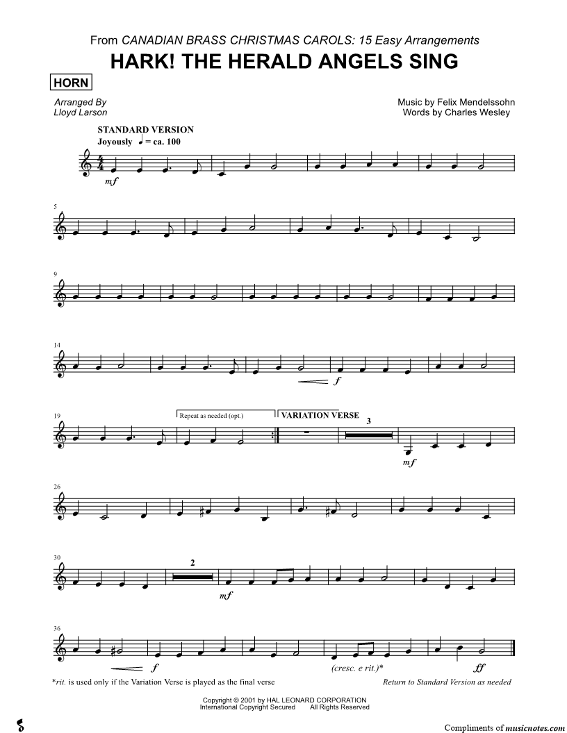 Hark! The Herald Angels Sing - French Horn (Brass Quintet) |