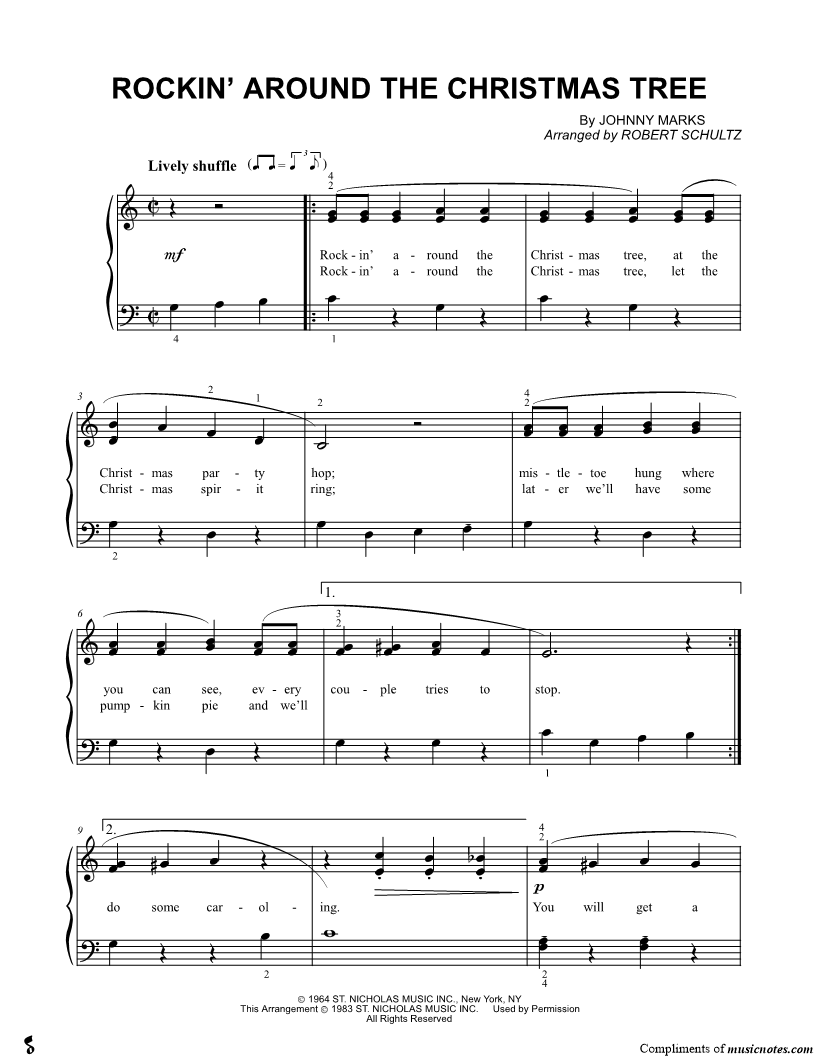 Rockin' around the Christmas tree, at the Christmas party hop; mistletoe hung where you can see, every couple tries to stop. |