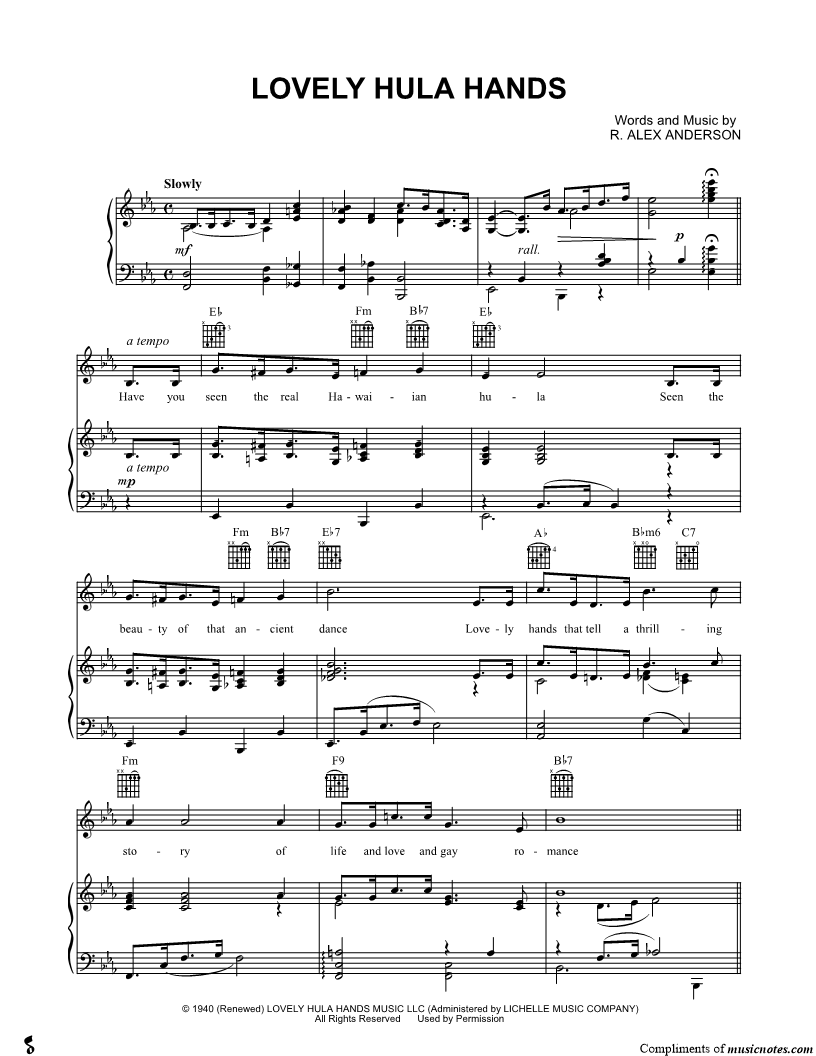 Have you seen the real Hawaiian hula Seen the beauty of that ancient dance Lovely hands that tell a thrilling story of life and love and gay romance Lovely hula hands graceful as a bird in motion Gliding like the gulls o'er the ocean, lovely hula hands. |
