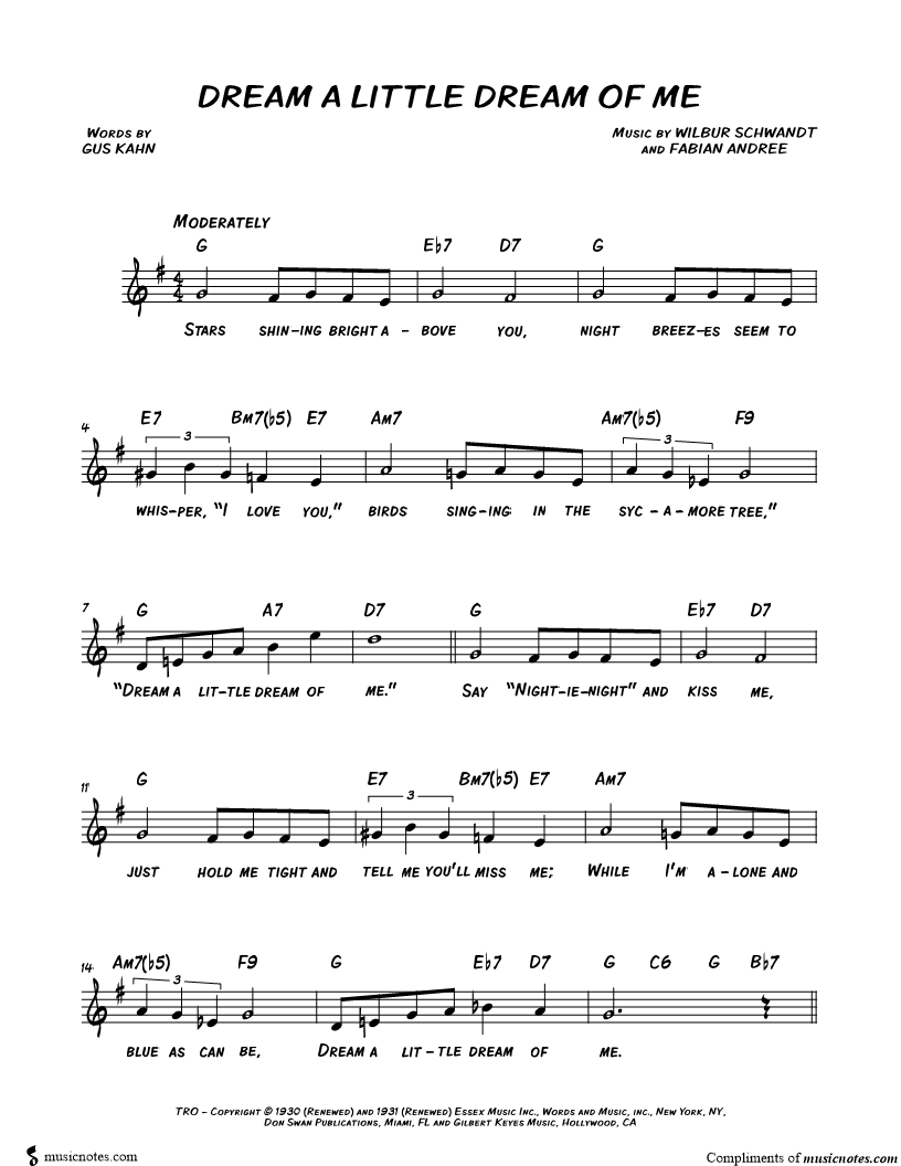 Stars shining bright above you, night breezes seem to whisper, "I love you," birds singing in the sycamore tree," "Dream a little dream of me." |