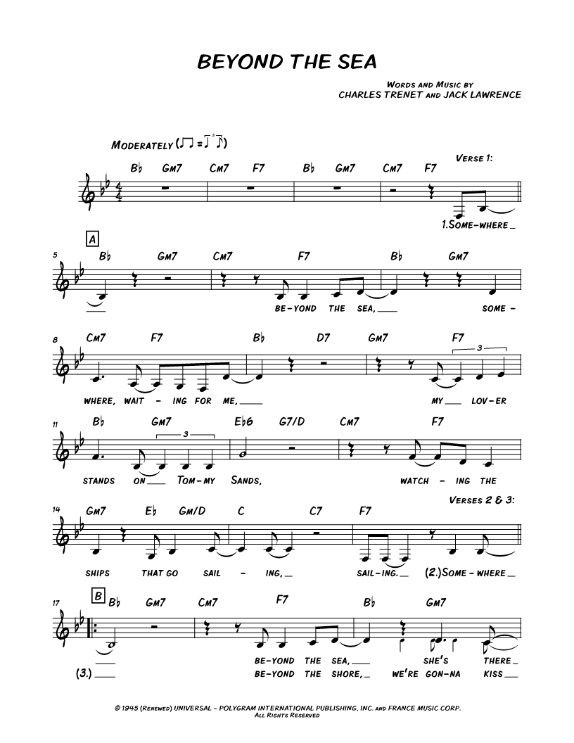 Somewhere beyond the sea, somewhere, waiting for me, my lover stands on Tommy Sands, watching the ships that go sailing, sailing.^ Somewhere beyond the sea, she's there waiting for me. |