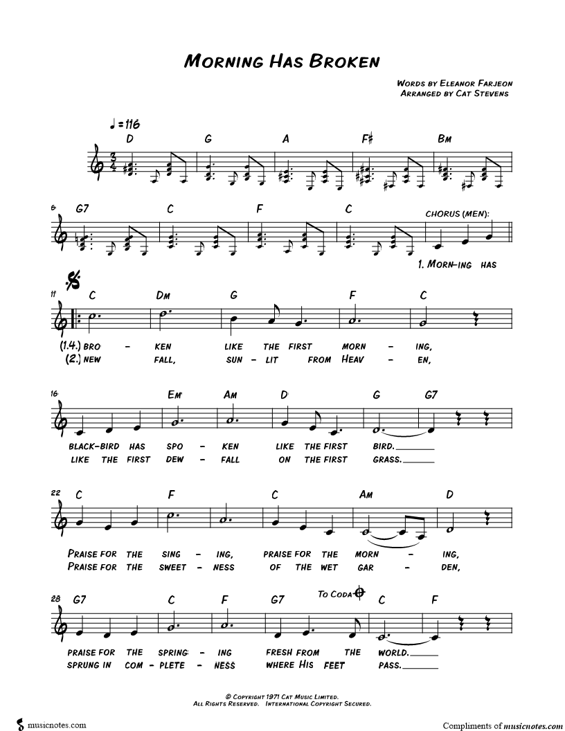 Morning has broken like the first morning, blackbird has spoken like the first bird. |