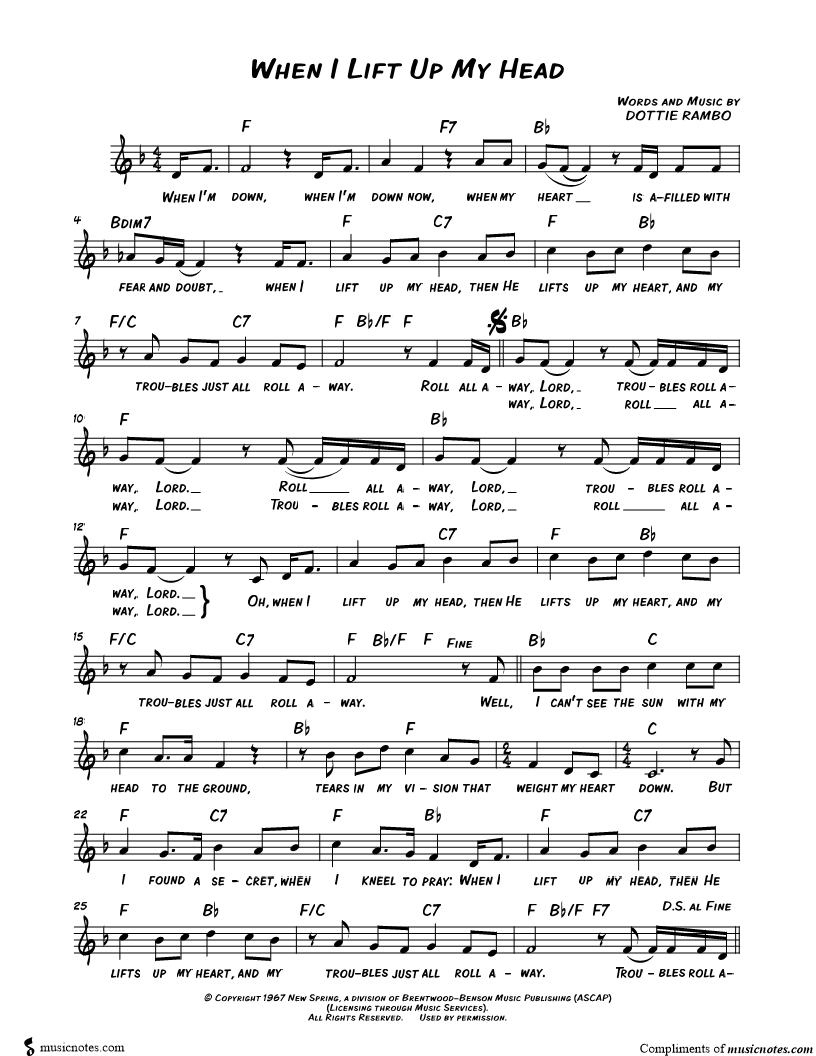 When I'm down, when I'm down now, when my heart is a-filled with fear and doubt, when I lift up my head, then He lifts up my heart, my troubles just all roll away. |