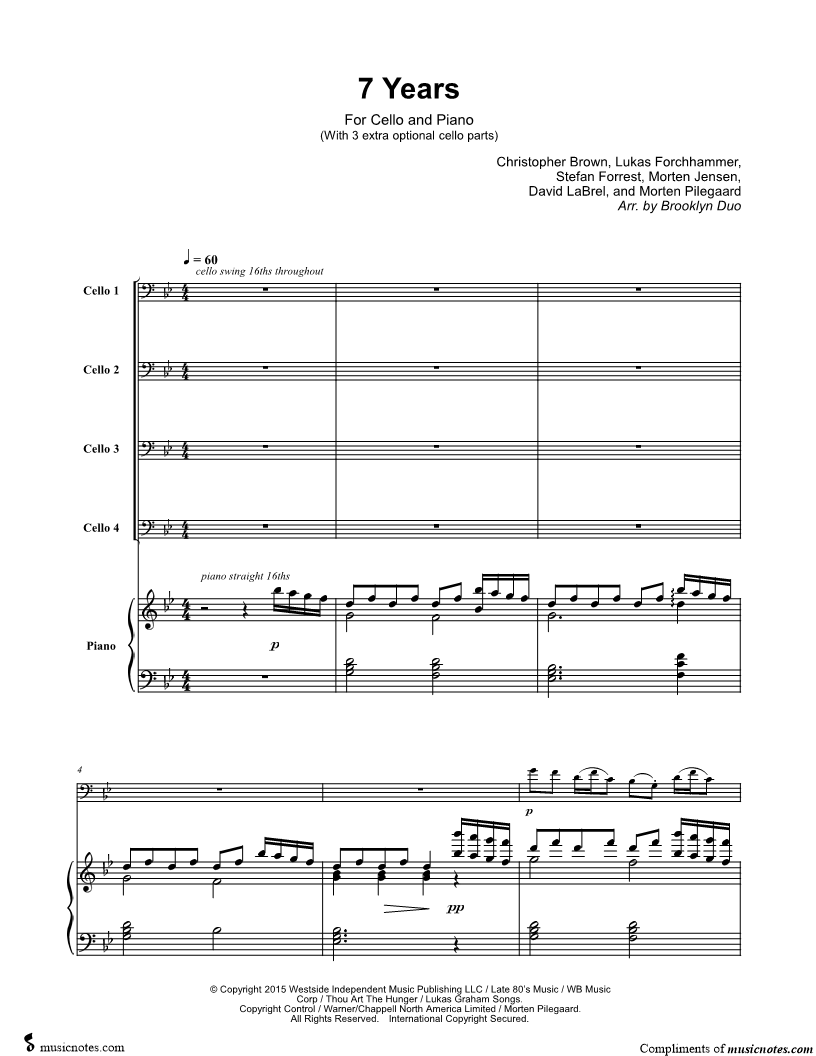 Cello 1, range: D2-Bb5 Cello 2, range: F3-D5 Cello 3, range: F3-D5 Cello 4, range: D2-Bb3 Piano | |