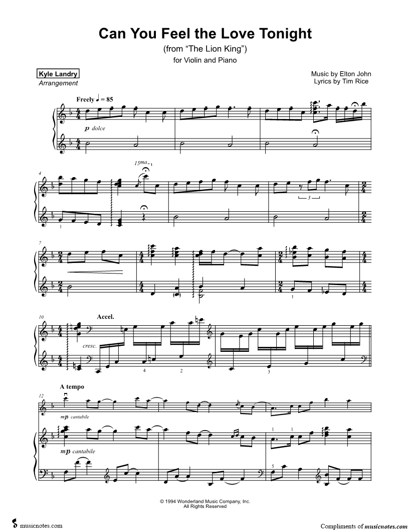 Can You Feel the Love Tonight - Violin & Piano |