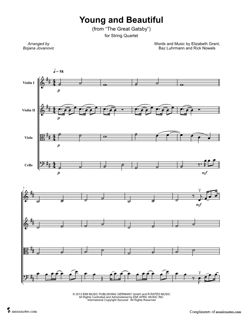 Violin 1, range: B3-A5 Violin 2, range: B3-F#5 Viola, range: E3-G4 Cello, range: E2-G4 | |