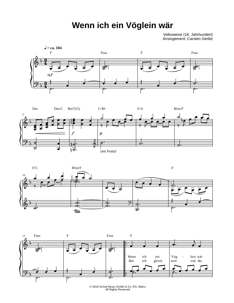Wenn ich ein Vöglein wär und auch zwei Flügel hätt, |