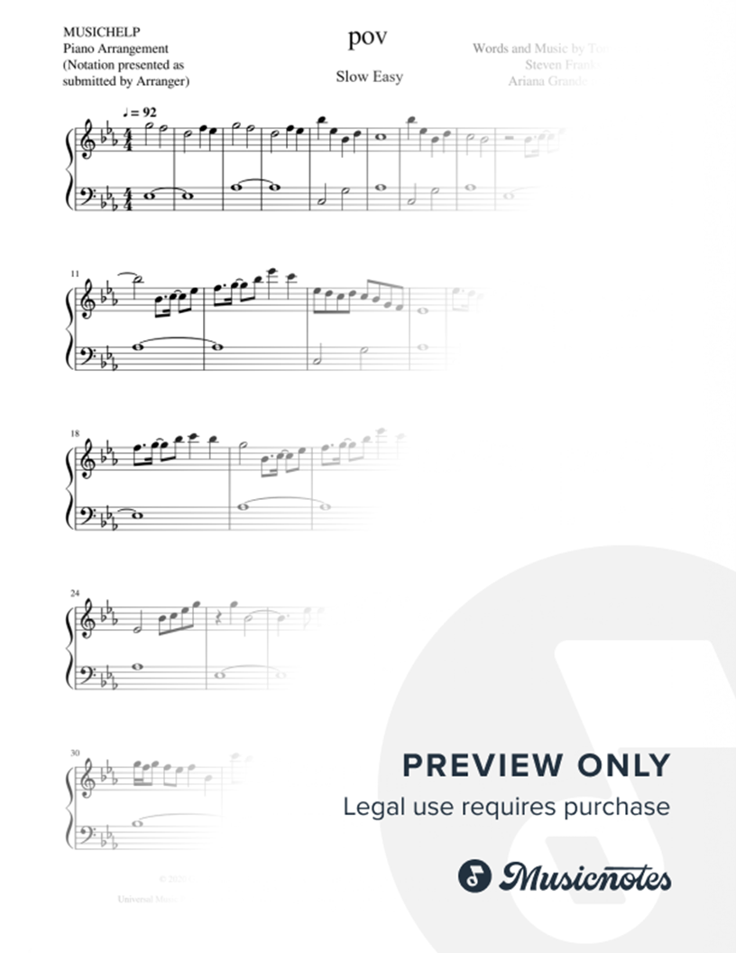 Musicnotes sells a wide variety of digital sheet music products including Singer Pros, Beginner Notes, Choral music, Piano Solos, Lead Sheets, Piano/Vocal/Guitar, Solo and Accompaniment, and fretted instrument tablature.