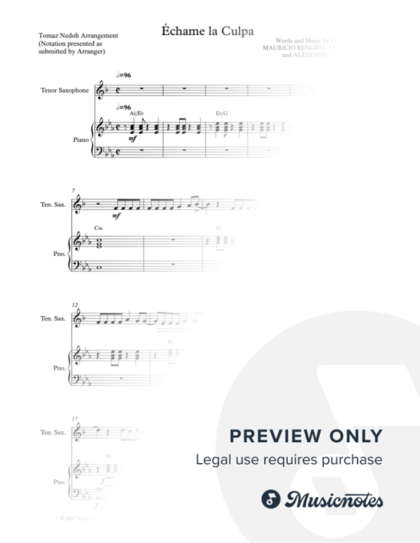 Échame la Culpa - Tenor Saxophone & Piano |