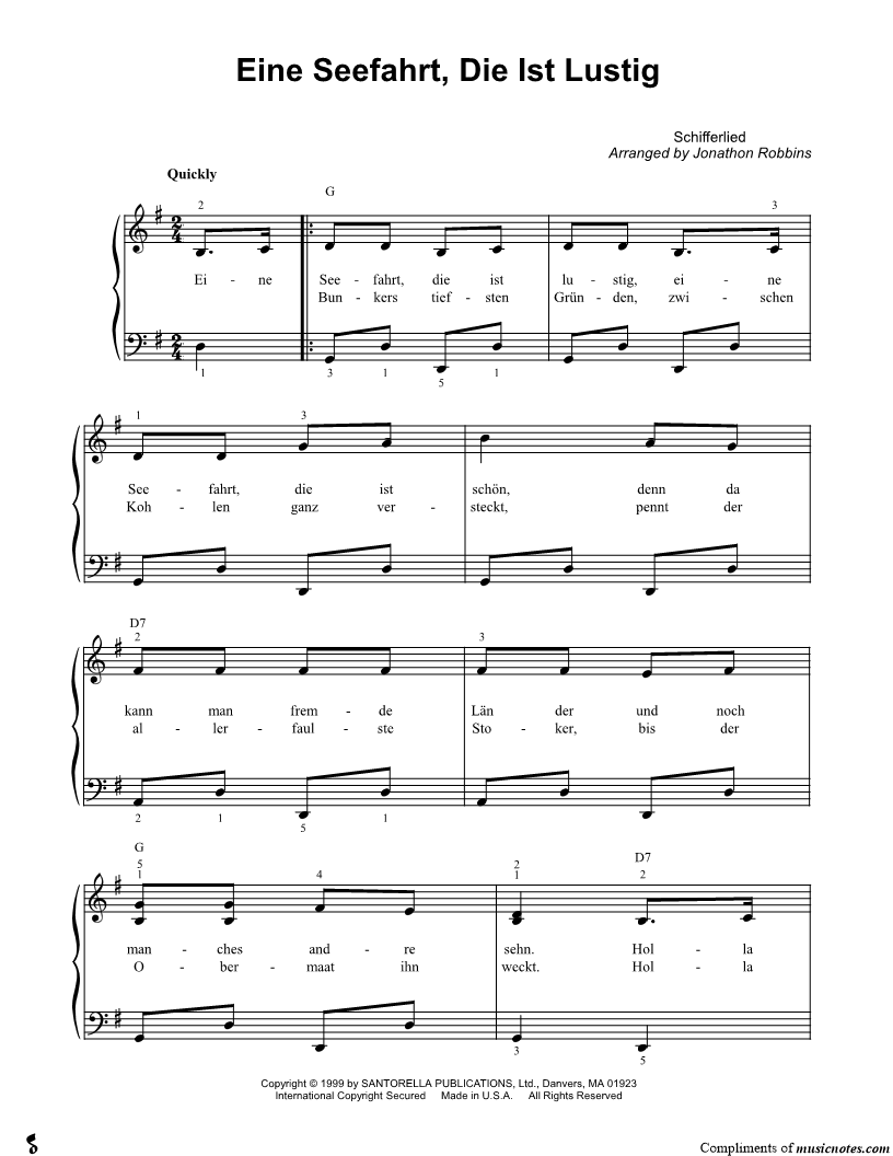 Eine Seefahrt, die ist lustig, eine Seefahrt, die ist schön, denn da kann man fremde Län der und noch manches andre sehn. |