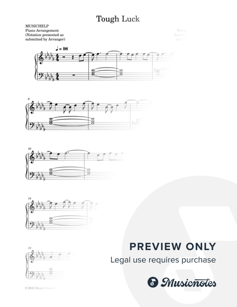 Many of the arrangements on Musicnotes have transpositions available, typically in C Major, as well as 3 sharps and 3 flats. If you do not see your desired key, you can request a transposition by reaching out to Customer Support.