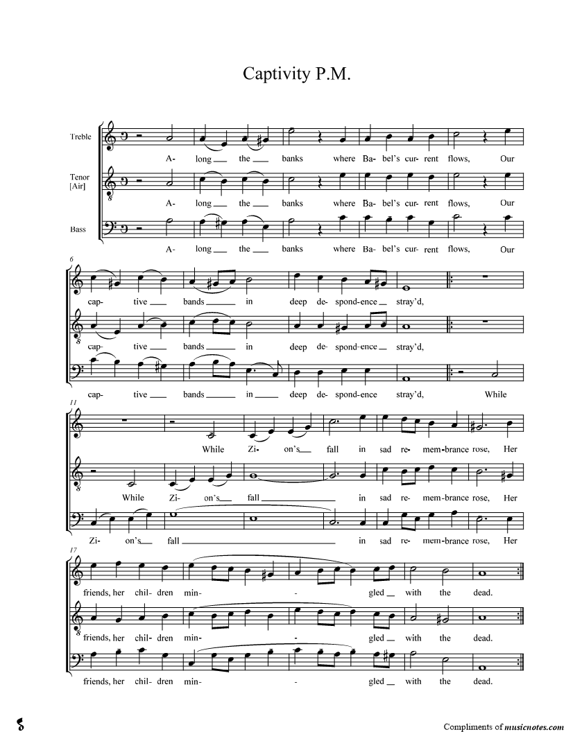 Along the banks where Babel's current flows, Our captive bands in deep despondence stray'd, While Zion's fall in sad remembrance rose, Her friends, her children mingled with the dead. |