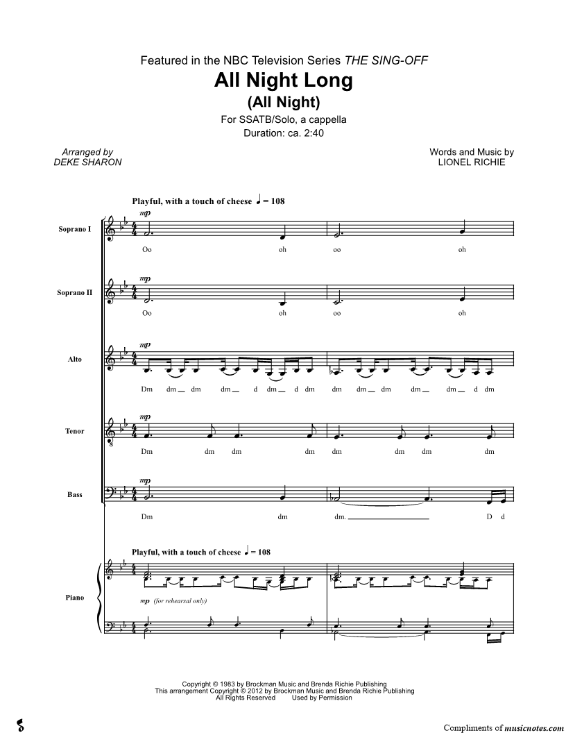 Voice, range: F3-Bb4 Soprano Voice 1, range: Bb3-Bb5 Soprano Voice 2, range: G3-D5 Alto Voice, range: G3-Bb4 Tenor Voice, range: Eb3-F4 Bass Voice, range: C2-D4 Piano SSATB Choir | |