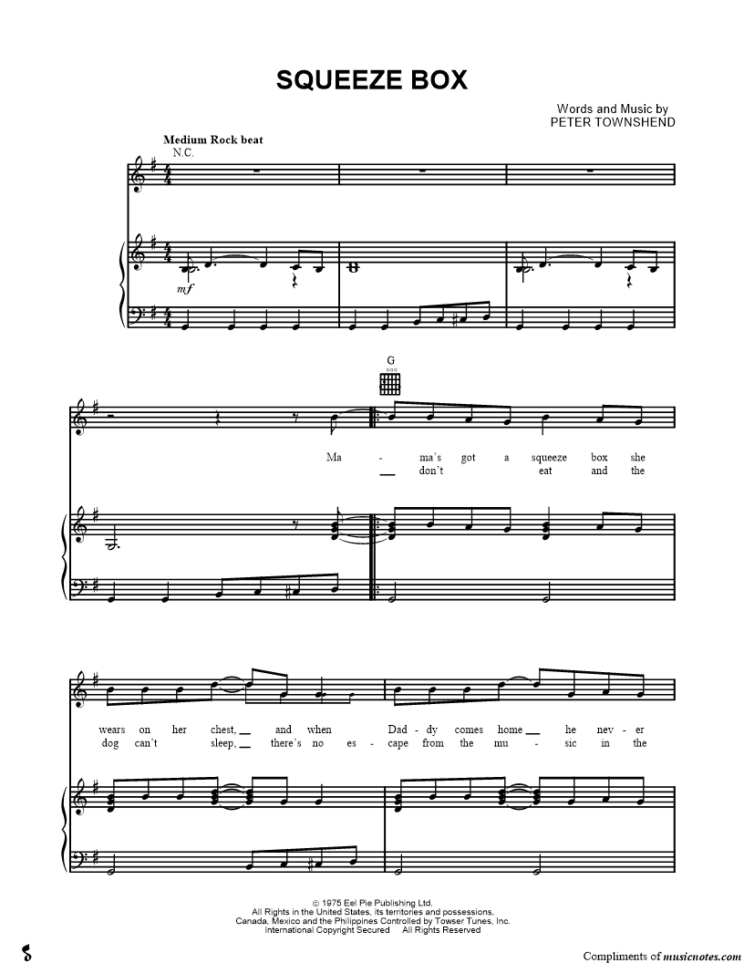 Mama's got a squeeze box she wears on her chest, and when Daddy comes home he never gets no rest. |
