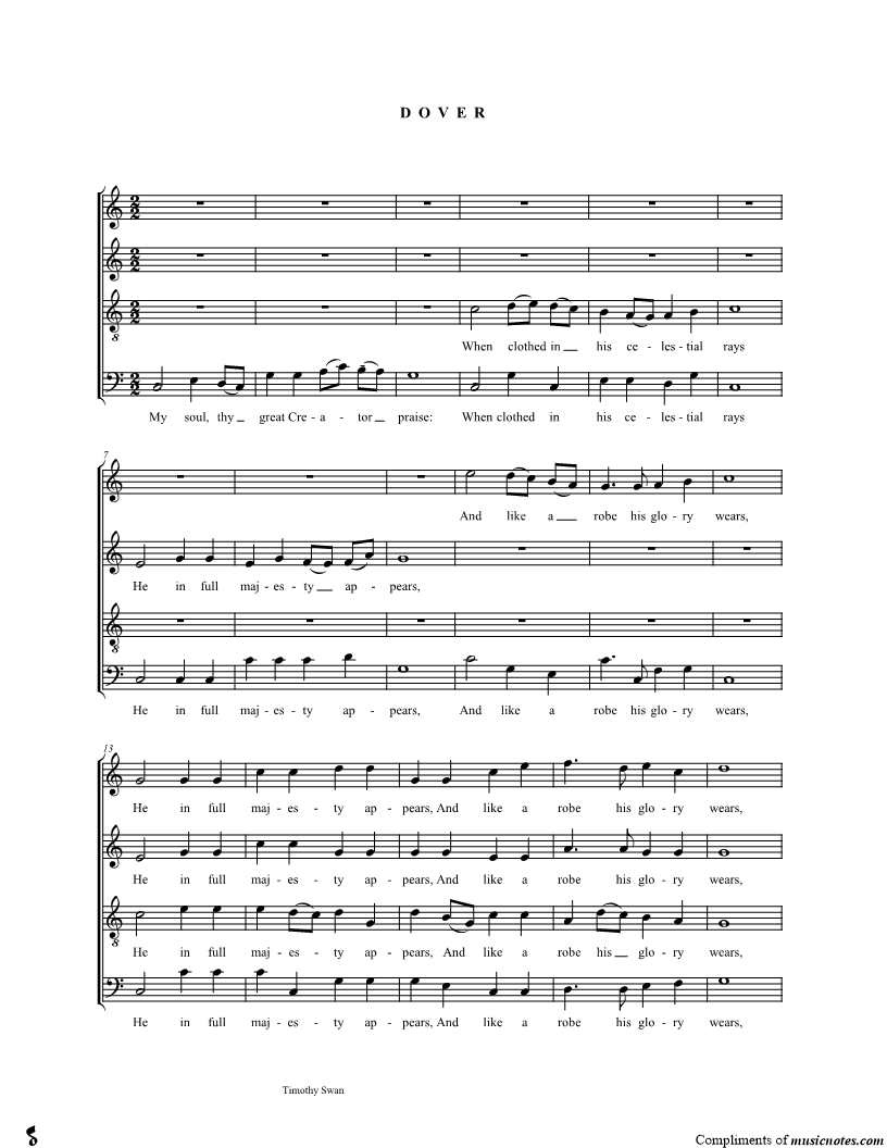 My soul, thy great Creator praise: When clothed in his celestial rays He in full majesty appears, And like a robe his glory wears. |