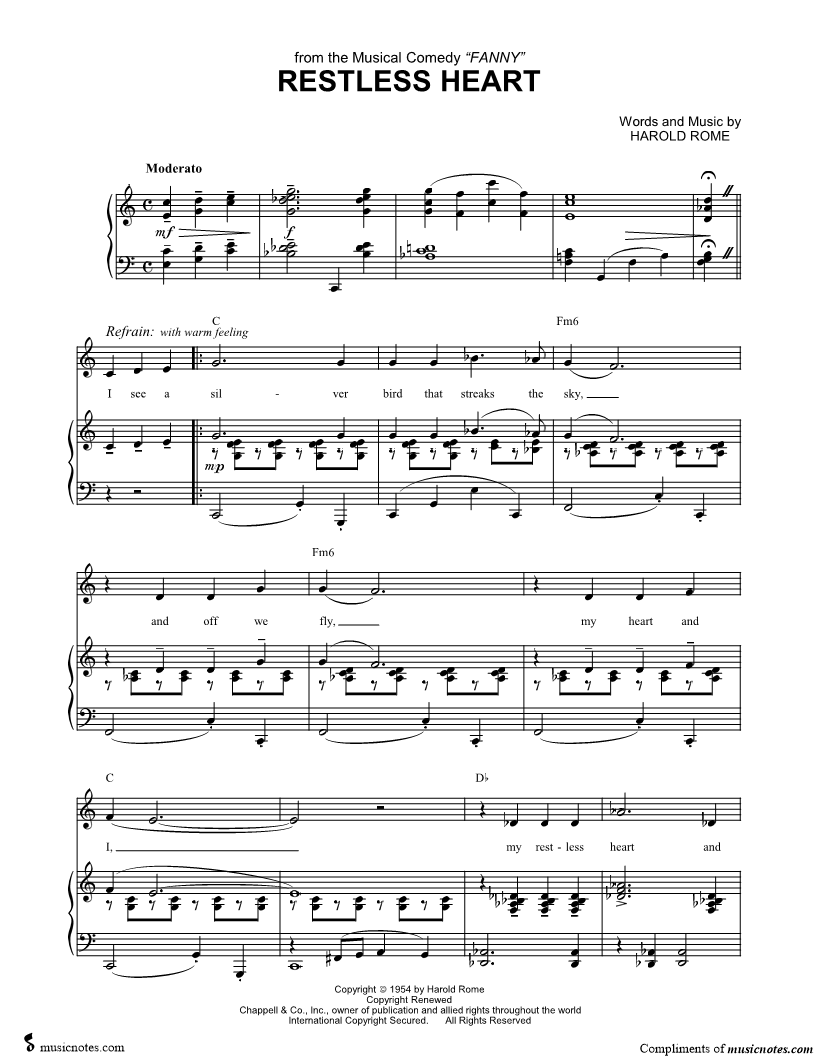 I see a silver bird that streaks the sky, and off we fly, my heart and I, my restless heart and I. |